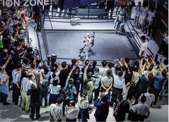 2025年9月25日,在第四届全球数字贸易博览会数智未来主题展区的杭州六小龙专区,观众观看宇树科技的人形机器人进行格斗擂台赛。图/新华